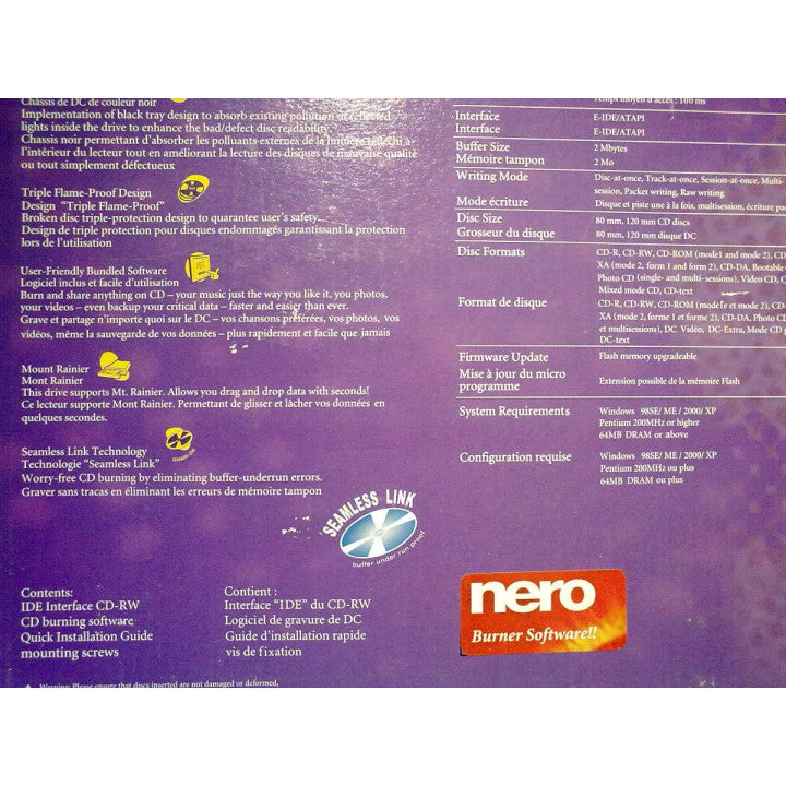| Ce graveur BENQ est destiné à graver les CD et CD réinscriptibles. Il est en version boîte, livré avec un CD contenant Nero Express 6.3.1.18 et INCD 4.2.12.0. Il intègre une Technologie Ultra DMA/33 améliorant l'intégrité des données en employant un contrôle de redondance cyclique (CRC) pour signaler les éventuelles erreurs de transfert de données. |