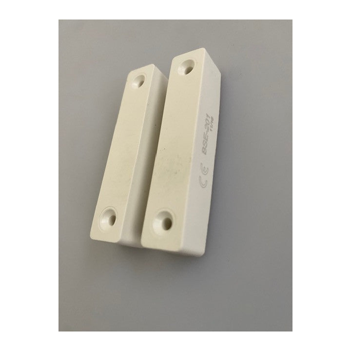Contact magnétique capteur nf saillie contacteur ouverture porte BSE-201 blanc Dimensions 65x12x13mm  . Poids 10gr.  Courant maximum de 500mA/12Vcc. Entraxe...