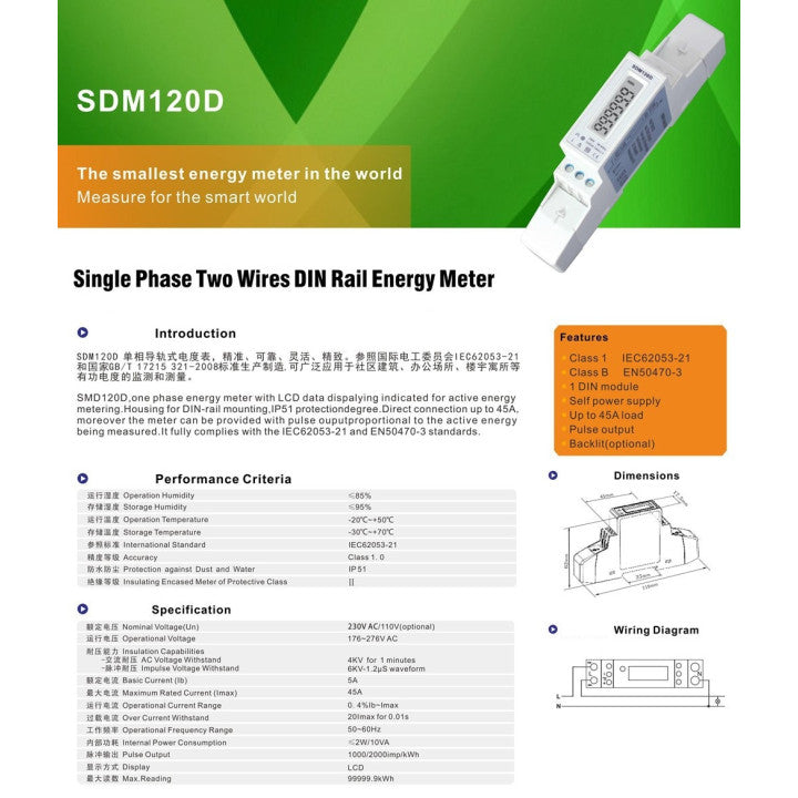 Ce compteur d'énergie électrique (kWh) monophasé sur rail DIN est une nouvelle génération de compteurs d'énergie électroniques monophasés, utilisant des techniques micro-électroniques, des circuits à haute intégration (LSI), des techniques numériques avancées et des techniques CMS. Le compteur satisfait aux exigences techniques applicables de la classe 1, classe 2 et IEC62052-11, IEC62053-21. Il est utilisé pour mesurer la consommation d'énergie active de manière exacte et directe depuis les réseaux à courant alternatif monophasé (50/60 Hz).