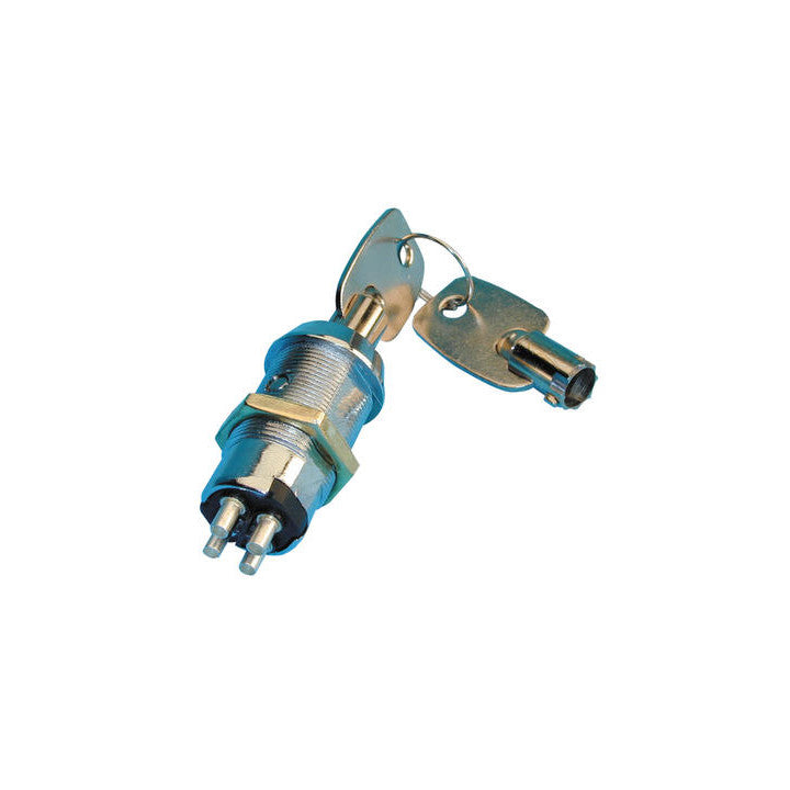 Serrure a clef. Ce type de serrure fonctionne exactement comme un bouton poussoir activé par une clé. Ces serrures possèdent 1 contact NO et 1 contact NF (4 plots) complètement indépendants qui autorisent de nombreuses mises en service par impulsions. 2 contacts : 1 NO et 1 NF. Tension sur contacts 5A/220Vca. Nombre de clés : 2 tubulaires.